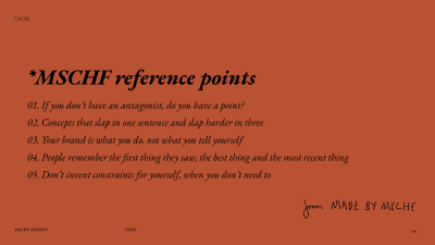 ‘Concepts that slap in one sentence and slap harder in three’. Can you articulate the strat/idea even design in one line? And if you develop it further, does it make it even better… or start distracting or degrading it?