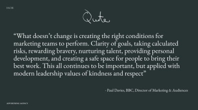 The role of senior marketers is to lead, guide and create an environment for a group of people to thrive in, whether they work in-house or are a partner. An opportunity for talent to do the best work of their careers.