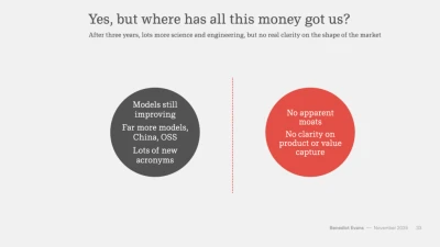 It’s eye watering the amount of investment that has gone into AI and the infrastructure/ecosystem that enables it. But what have we got to show for it? More models, that are slightly better and more niche experiments, everyone hoping they create ‘the one’ that dominates the market. On the ground companies are finding it tough to show cold hard results for the time and money they're putting into initiatives, will 2026 start showing ROI?