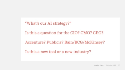 Is it the CEO/CTO/CMO, which one? Is it all of them? Is it a Deloitte or Publicis you need to come in and help? Is it an indie specialist? Reality is, it’s so new, it’s a mix of leadership roles and specialists. And what is the most helpful thing right now is to start with the problem in mind, with the customer at the heart of it. So if you want to improve customer satisfaction using GenAI, does it help or detract from that?